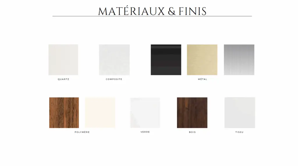 Une planche d’inspiration a été conçue autour de lignes sobres, de couleurs neutres (blanc chaud, gris clair, noir mat) et de matières modernes comme le bois naturel, le stratifié lisse et le métal noir.